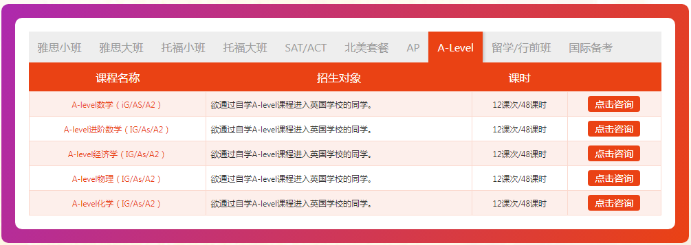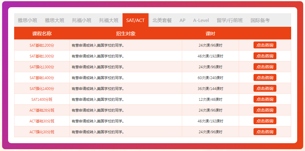 雅思起步6分小班、雅思预备6分小班、雅思入门6分小班、雅思精品6分小班、雅思起步6.5分小班、雅思预备6.5分小班、雅思入门6.5分小班、雅思精品6.5分小班、雅思强化6.5分小班、雅思入门7分小班、雅思精品7分小班、雅思强化7分小班、雅思考前速递小班、雅思写作单项班、雅思口语单项班。